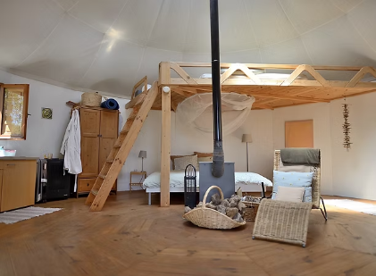 Die baubiologischen Yurten wurden mit viel Liebe zum Detail handgefertigt. Großzügig und zugleich geborgen bieten sie traumhaftes Wohnen mit mediterranem Meerblick. Jede Yurte verfügt über eine eigene Toilette und Dusche.